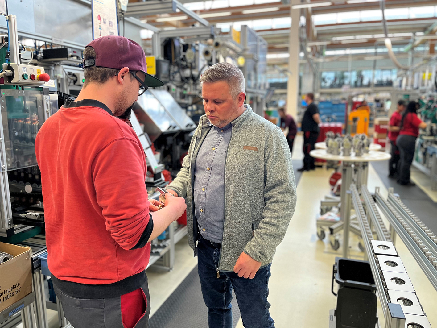 Thomas Breuer, Werkleiter Werk 4 (rechts), verabschiedet József Nádudvari kurz vor seiner 40 Fahrt zum Werk 18. Wie der Aufbau der Elektrowerkzeug- Montage zwischen Thüringen und Kecskemét vor- bereitet wird. Heute feiert József Nádudvari ein klei- nes Jubiläum. Seine 40. Fahrt von Werk zu Werk: Genauer von Werk 18, seiner Heimat in Kecskemét, Ungarn, zum Werk 4 in Thüringen, Vorarlberg. «Am liebsten fahre ich sonntags, da ist die Autobahn frei und ich kann am Montagmorgen gleich die ersten Kollegen treffen.» Begonnen hat alles vor drei Jahren, als ihm angeboten wurde, ab 2024 die Leitung der Montageeinheit im Werk 18 zu übernehmen. Kurz zuvor hatte das EB den Beschluss gefasst, das Werk zu erweitern. Bisher werden Elektrowerkzeuge nur an zwei Hilti Standor- ten hergestellt: Werk 4 in Thüringen und Werk 88 in Shanghai. «Mit dem Ausbau in Ungarn wird unser Manufacturing Footprint variabler und die nötige Kapazität für das anstehende Wachstum geschaf- fen», sagt Thomas Breuer, Werkleiter Werk 4, der die strategische Planung dazu von Beginn an begleitet hat. 4500 m2 Montagefläche entstehen in Ungarn, eine ähnliche Grösse, wie sie heute in Werk 4 in der Montagehalle existiert. Baubeginn war im August 2022. Im April 2024 soll die Produktion aufgenom- men werden. 2025 sollen bereits 150 000 Bohr- und Meisselhämmer «made in Hungary» die Produkti- onshalle verlassen. «Als Unitleiter habe ich viel Erfahrung», sagt József, der 11 Jahre lang die Produktionseinheit geleitet hat, die für die Herstel- lung der Hilti Meissel zuständig ist. «Aber mit der Montage von Elektrowerkzeugen hatte ich bisher kaum Berührung. Eine spannende wie herausfor- dernde Aufgabe. Da gilt es einiges zu lernen!» Am 1. Mai 2021 wurde József als Teamleiter für die Montage der kleinen Kombihämmer, TE30 und TE50, im Werk 4 vorgestellt. Genau die Produkte, die im Jahr 2024 nach P18 übersiedeln. «16 Monate lang, bis Oktober 2022, habe ich die Montage Tag für Tag begleitet. Das war der berühmte Sprung ins kalte Wasser! Neue Aufgabe, neue Umgebung, das Ganze auf Deutsch. Die Kolleginnen und Kollegen in Werk 4 waren sehr geduldig mit mir, haben mir alles gezeigt, hatten immer ein offenes Ohr für mich. Jetzt weiss ich ziemlich genau, was mich erwartet. Der tägliche Austausch mit den Montage- mitarbeiter:innen, den Technologiespezialist:innen und den Materials Manager war unersetzlich.» Seit seiner Rückkehr nach Ungarn hat er einen festen Rhythmus. Auf drei Wochen in Kecskemét folgt eine Woche in Thüringen. József koordiniert den Know-how-Aufbau in allen nötigen Funktionen. Es sind viele Funktionen, die dazu beitragen, dass das richtige Produkt in der richtigen Qualität und Menge das Werk zum richtigen Zeitpunkt verlässt. «Wir haben ca. 15 Schlüsselkompeten- zen definiert, die wir in der Zeit bis zur Verlage- rung aufbauen wollen. Dazu kommen Kolleg:in- nen aus P18 drei bis zwölf Monate lang hier nach Thüringen. Was mir die Arbeit besonders erleichtert, ist, dass ich ein tolles Netzwerk in Werk 4 aufbauen konnte.» Denn es müssen viele Funktionen Hand in Hand arbeiten. «Es geht ja nicht nur um den Zeitraum, in dem die Kandi- dat:innen in Werk 4 sind. Wir fassen ihre persön- liche Entwicklung in den kommenden drei bis fünf Jahren ins Auge: Übergabe der jetzigen Aufgabe, dann die Zeit vor Ort, danach die Übergangszeit, bis die Arbeit in P18 tatsächlich aufgenommen wird. Alle, die wir nach Thüringen schicken, fungieren danach als Schlüsselperso- nen, auf die wir uns in der neuen Organisation verlassen können wollen!», sagt Gyula Takács, Werksleiter von Werk 18, und dankt dabei den Personalabteilungen aus beiden Organisatio- nen, die diese Transfers und die Personalpla- nung neben ihren «normalen» Aufgaben bewälti- gen. Und dann ist da ja noch der tatsächliche Umzug der Montagelinien, für den pro Linie sechs Wochen eingeplant werden: zwei Wochen Abbau, zwei Wochen Transport, zwei Wochen Aufbau und Inbetriebnahme. Um die Märkte in dieser Zeit, in der nicht produziert wird, versor- gen zu können, wird ein Vorrat von zwei Mona- ten vorproduziert, insgesamt fast 30 000 Geräte. An dieser Vorproduktion werden dann auch meine zukünftigen Montagemitarbeiter:in- nen schon beteiligt sein und gemeinsam mit den erfahrenen Kolleg:innen die zusätzlichen Geräte produzieren, bevor sie dann quasi gemeinsam mit den Montagelinien nach Kecskemét zurück- kehren. Es ist mittlerweile Donnerstagnachmittag und József macht sich bald auf den Weg zurück nach Kecskemét. «Wenn wir nächstes Jahr in Kecskemét starten, sind die Produkte und Montagelinien für mich hoffentlich wie gute alte Bekannte. Ich kenne ihre Tücken und Eigenarten und freue mich, sie in neuer Umgebung wieder- zusehen.» Und was wird mit der freiwerdenden Fläche in Werk 4? Dazu hat Thomas Breuer eine Antwort: «Da ist jeder Quadratmeter schon wieder verplant. Offen gesagt haben wir derzeit schon ein Platzproblem! Neue Montagelinien, die im Laufe dieses Jahres produktionsreif werden sollen, platzieren wir übergangsweise auf unse- rem Marktplatz, der eigentlich für Pausen und Versammlungen reserviert ist, bevor unsere Montagehalle 2024 dann eine neue Ordnung bekommt.» SPOTLIGHT 30-31
